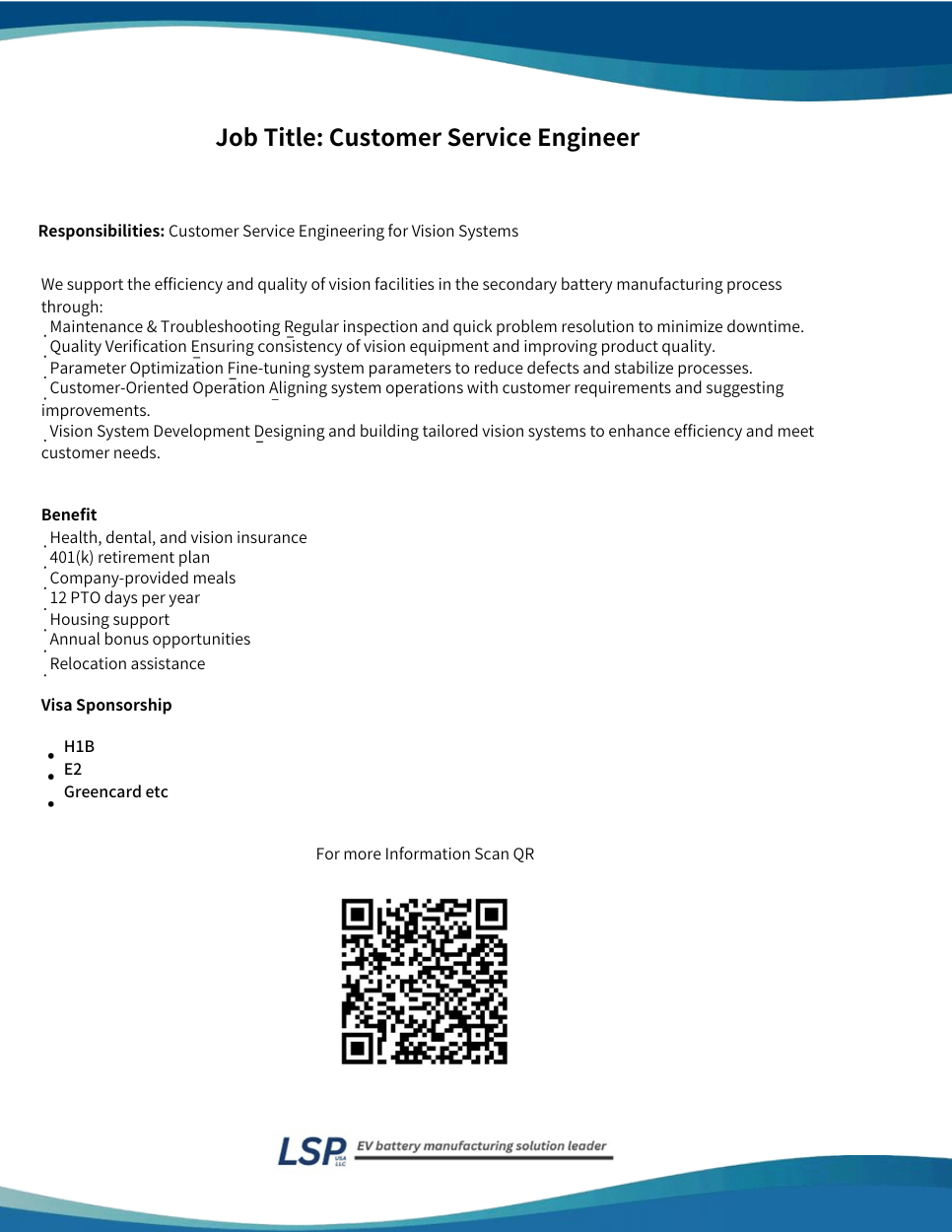 Customer Service Engineer Job Title: Customer Service Engineer Responsibilities: Customer Service Engineering for Vision Systems We support the efficiency and quality of vision facilities in the secondary battery manufacturing process through: Maintenance & Troubleshooting Regular inspection and quick problem resolution to minimize downtime. Quality Verification Ensuring consistency of vision equipment and improving product quality. Parameter […]